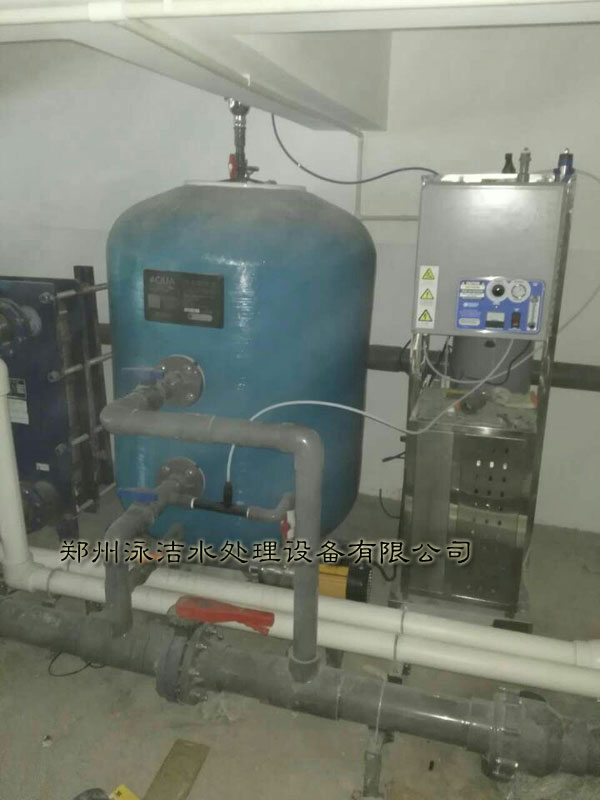 機房內部已經安裝完畢、次游泳池采用的是逆流式、采用的是砂缸循環過濾系統、臭氧反應器、板式換熱器、水箱等游泳池水處理設備
