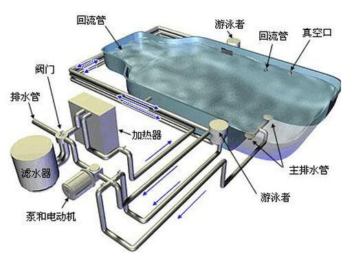 游泳池水處理設備的基本工作原理是持續不斷地循環抽水:從泳池抽到過濾和化學處理系統,然后再送回泳池。這樣,抽吸系統可以使泳池中的水較為干凈,基本無污泥、垃圾和細菌。一些泳池還有加熱器,可以使水溫保持恒定。